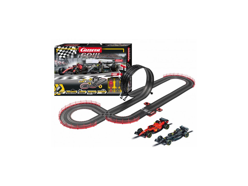 Autodráha Carrera GO!!! dlouhá 5,3m s auty F1 Ferrari a Mercedes, obsahuje looping, křižovatku, rovinky, zatáčky, díl s počítadlem kol a další díly. Můžete si sestavit další různé trati podle své fantazie.