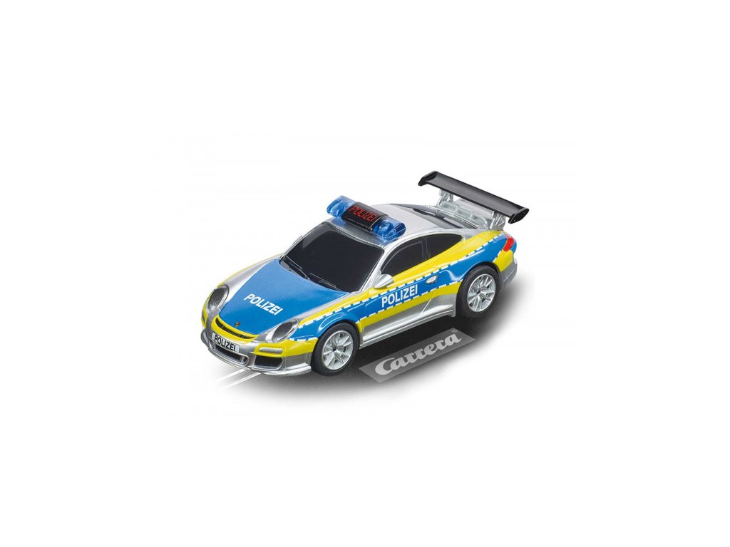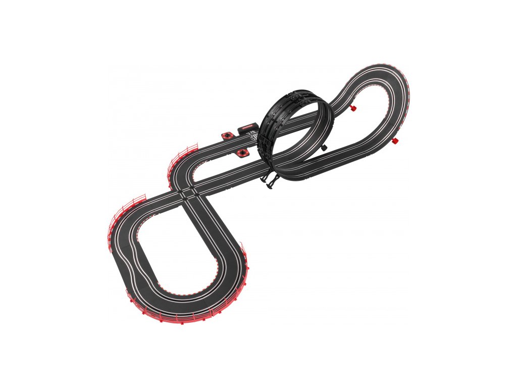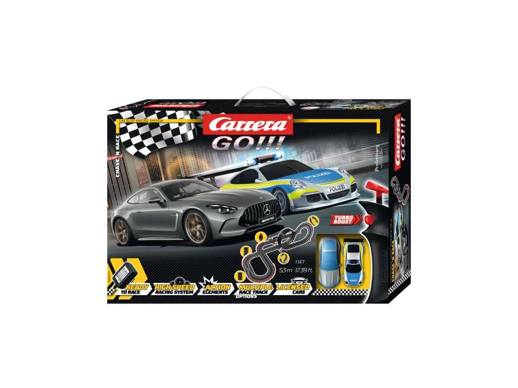 Autodráha Carrera GO!!! dlouhá 5,3m s auty Mercedes-AMG GT 63 a policejním Porsche 911 GT3, obsahuje looping, křižovatku, rovinky, zatáčky, kolmou stěnu, díl s počítadlem kol a další díly. Můžete si sestavit další různé trati podle své fantazie.