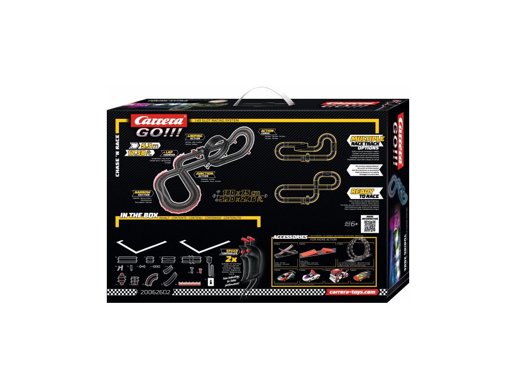 Autodráha Carrera GO!!! dlouhá 5,3m s auty Hypercars, obsahuje křižovatku, rovinky, zatáčky, kolmou stěnu, zúžení dráhy, looping, díl s počítadlem kol a další díly. Můžete si sestavit další různé trati podle své fantazie.