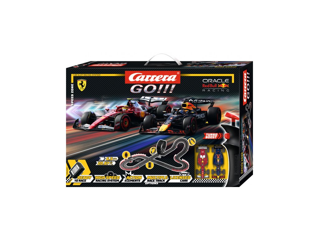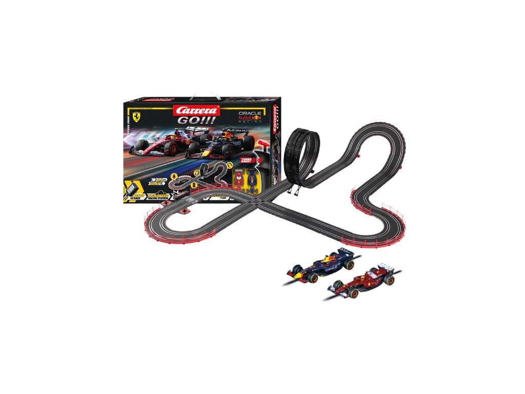 Autodráha Carrera GO!!! dlouhá 6,3m s auty F1 Red Bull a Ferrari, obsahuje, křižovatku, rovinky, zatáčky, kolmou stěnu, looping, díl s počítadlem kol a další díly. Můžete si sestavit další různé trati podle své fantazie.