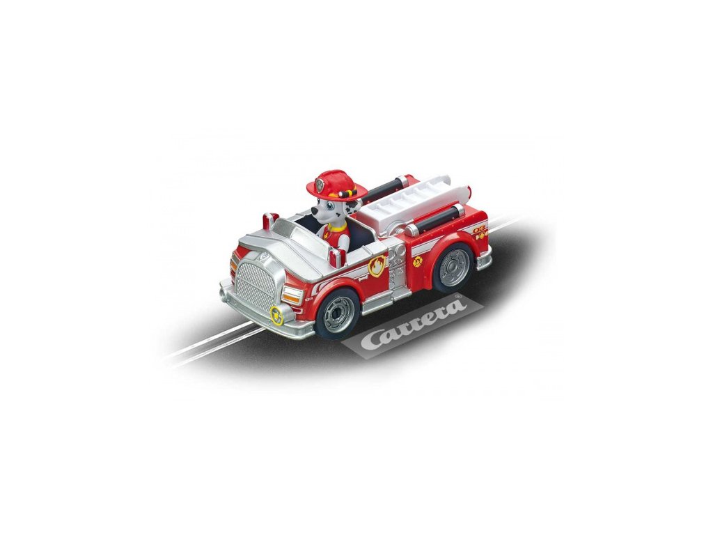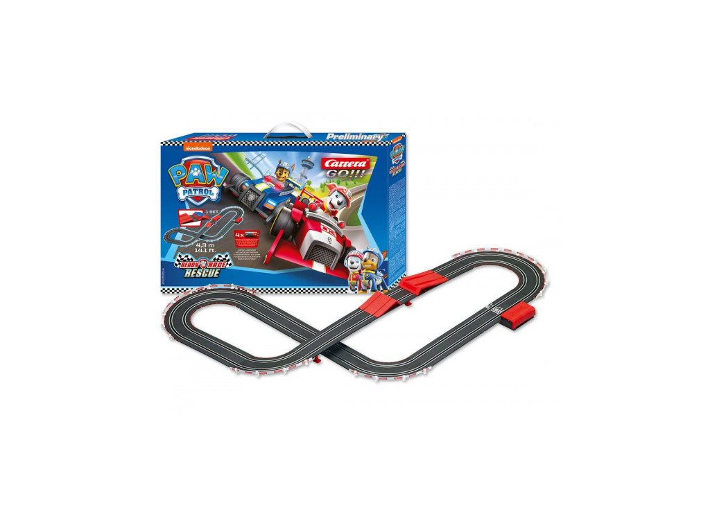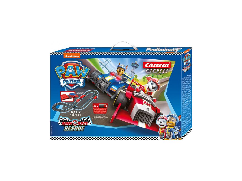 Autodráha Carrera GO!!! dlouhá 4,3m s auty z filmu Tlapková Patrola Chase a Marshall obsahuje skokánek, rovinky, zatáčky, přemostění, napájecí díl na baterie a další díly. Autodráha je kompatibilní s auty a díly GO!!!. Do napájecího dílu je možné dát buď baterie nebo trafo (kód 61531 - nejsou součástí balení)