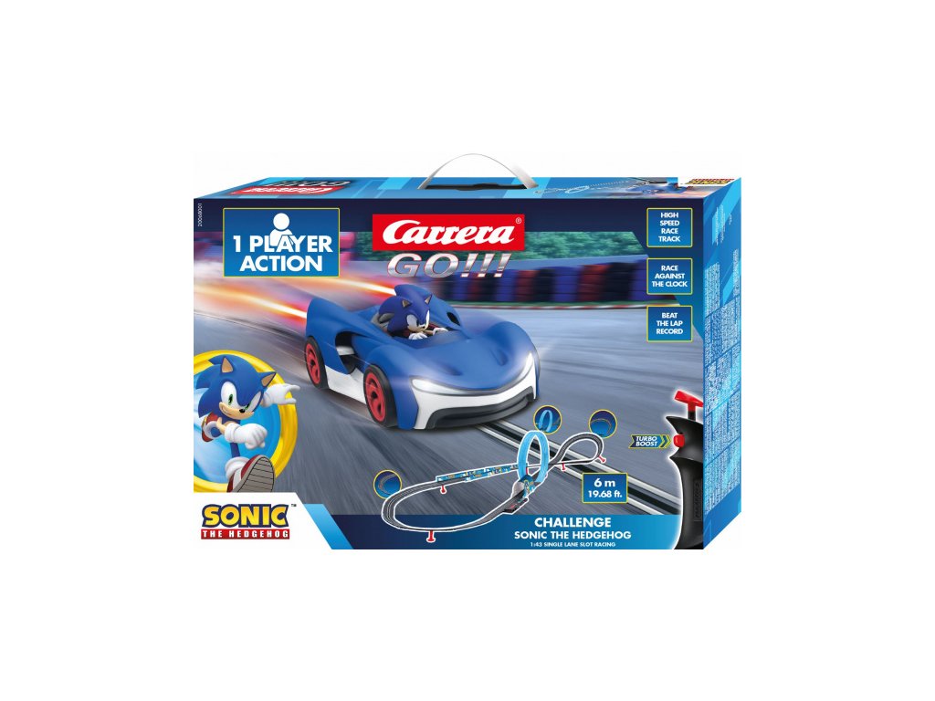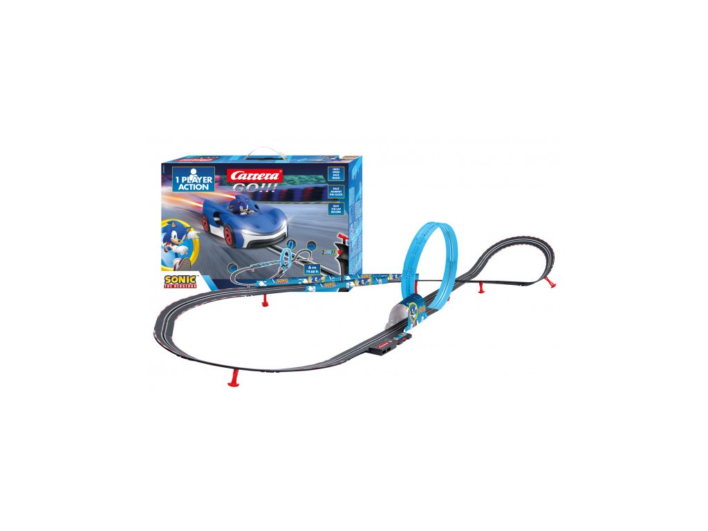 Autodráha Carrera GO!!! dlouhá 6m s autem Sonic, obsahuje looping, klopenou zatáčku, kolmou stěnu, rovinky, zatáčky, díl s počítadlem kol a další díly. Můžete si sestavit další různé trati podle své fantazie. Jedna dráha, jedno auto, jeden ovladač.
