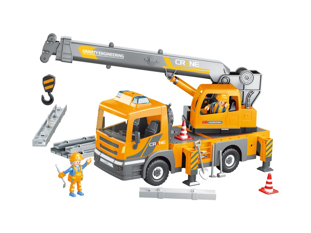 Autojeřáb s efekty, stavebnice. Velikost jeřábu 41 cm. Pohyblivé rameno jeřábu. Světelné a zvukové efekty. Baterie 2xAAA není součástí balení.