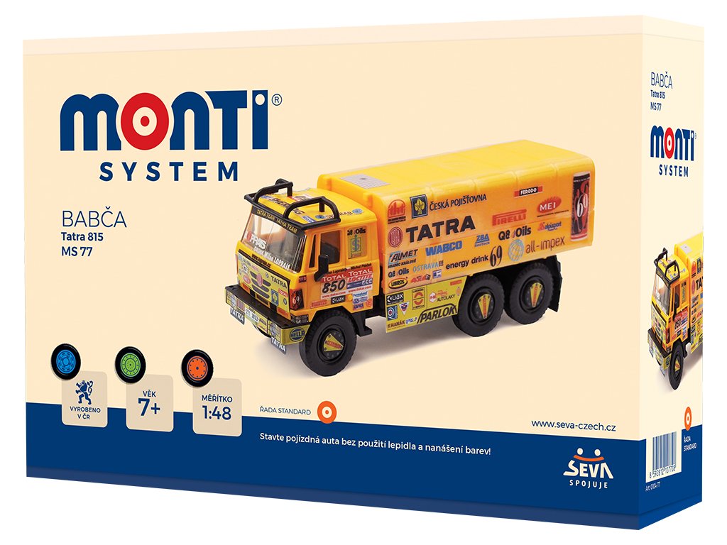 Dětská stavebnice Monti System č.77 - BABČA TATRA 815 - tento model je inspirován skutečnou Tatrou 815 6x6, která se účastnila v roce 2009 jako doprovodný vůz slavné rallye Paříž - Dakar. Součástí balení jsou samozřejmě i polepy, které jsou věrnou kopií originálních samolepek. Sestavuje se bez nutnosti použití lepidla a nanášení barev, jednotlivé díly vyrobené z barevného plastu do sebe přesně zapadají. Je jedinečná v jednoduchosti a rychlosti montáže (i demontáže) užitím propracovaného konstrukčního systému pružných zaklapávacích a zasunovacích zámečků. Náročnost sestavení: STANDARD