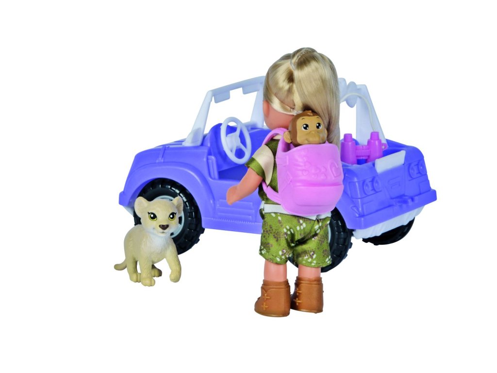 Panenka Evička v safari oblečení a s terénním autem. Nechybí batůžek, malá opička, lvíček a dalekohled. Délka auta 16 cm. Výška panenky 12 cm.