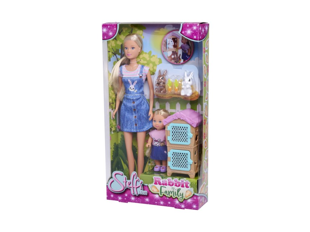 Steffi s Evičkou a králičí rodinkou. Součástí jsou 2 králíci, mrkve, králíkárna. Velikost panenky Steffi 29 cm, Evička 12 cm.