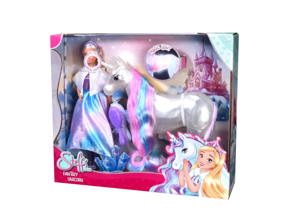 Panenka Stefii v kouzelných šatech jako princezna s jednorožcem, který svítí a má dlouhou hřívu na česání. Výška panenky 29 cm.