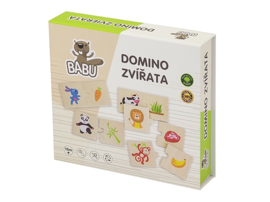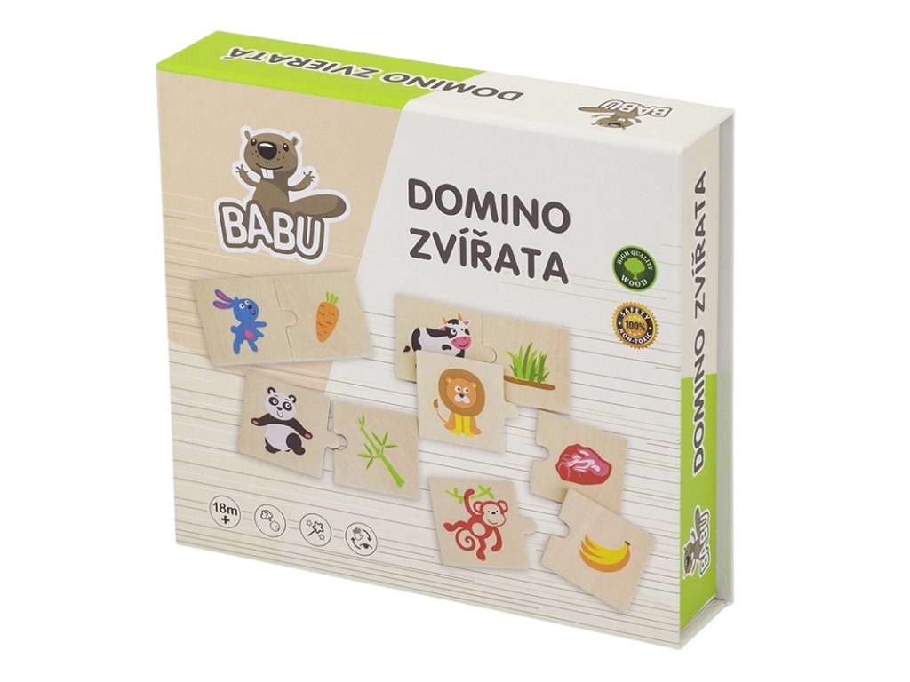 Klasická dětská stolní hra – domino. Hračka je vyrobená ze dřeva. Domino se hodí pro nejmenší děti – na kostičkách jsou obrázky zvířátek. Z kolekce dřevěné hračky od kvalitní značky BABU. - Věk 2+