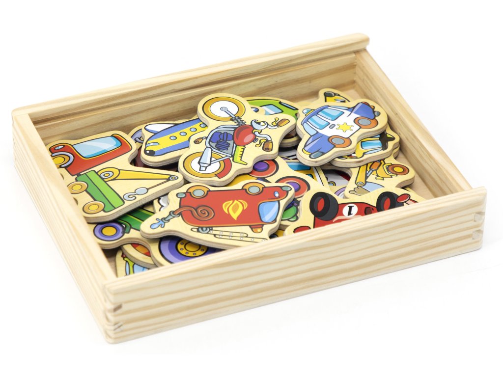 Magnetky 20 ks - doprava - dřevěné magnetky znázorňující dopravní prostředky, v praktické krabičce. Z kolekce dřevěných hraček od kvalitní značky BABU. Sada obsahuje 20 magnetek.
