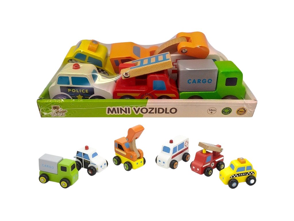 Přinášíme Vám hračku, která je určena pro nejmenší. Se zmenšenými užitkovými autíčky (taxi, policie, bagr, hasiči, náklaďák, sanitka) si Vaše dítě užije spoustu zábavy. Hračka rozvíjí dětskou koordinaci a motoriku. Počet kusů v balení 6. Z kolekce dřevěné hračky od kvalitní značky BABU. - Rozměr hračky: 25x12x9cm - Věk 18m+