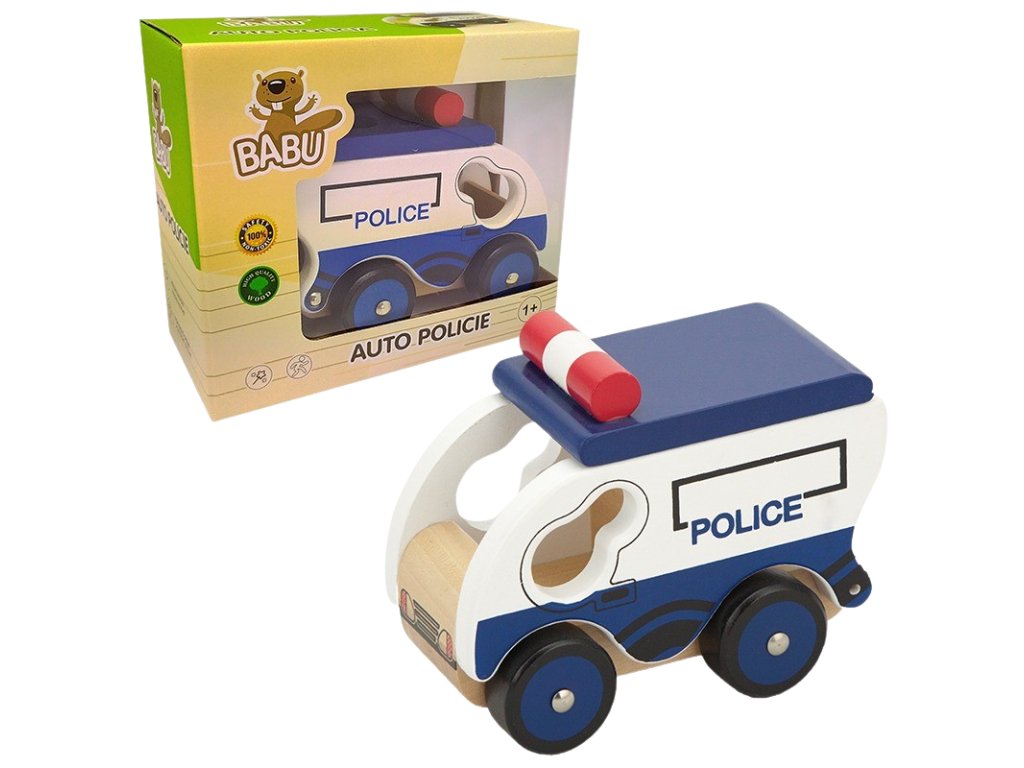 Policejní auto ze dřeva. Krásná tradiční hračka. Autíčko má nákladní prostor. Dopředu posaď figurku policisty a dozadu zavři zločince! Z kolekce dřevěné hračky od kvalitní značky BABU. - Rozměr hračky: cca 13x10x7cm - Rozměr balení: cca 16x14x8cm