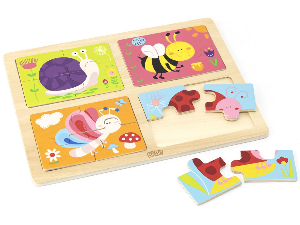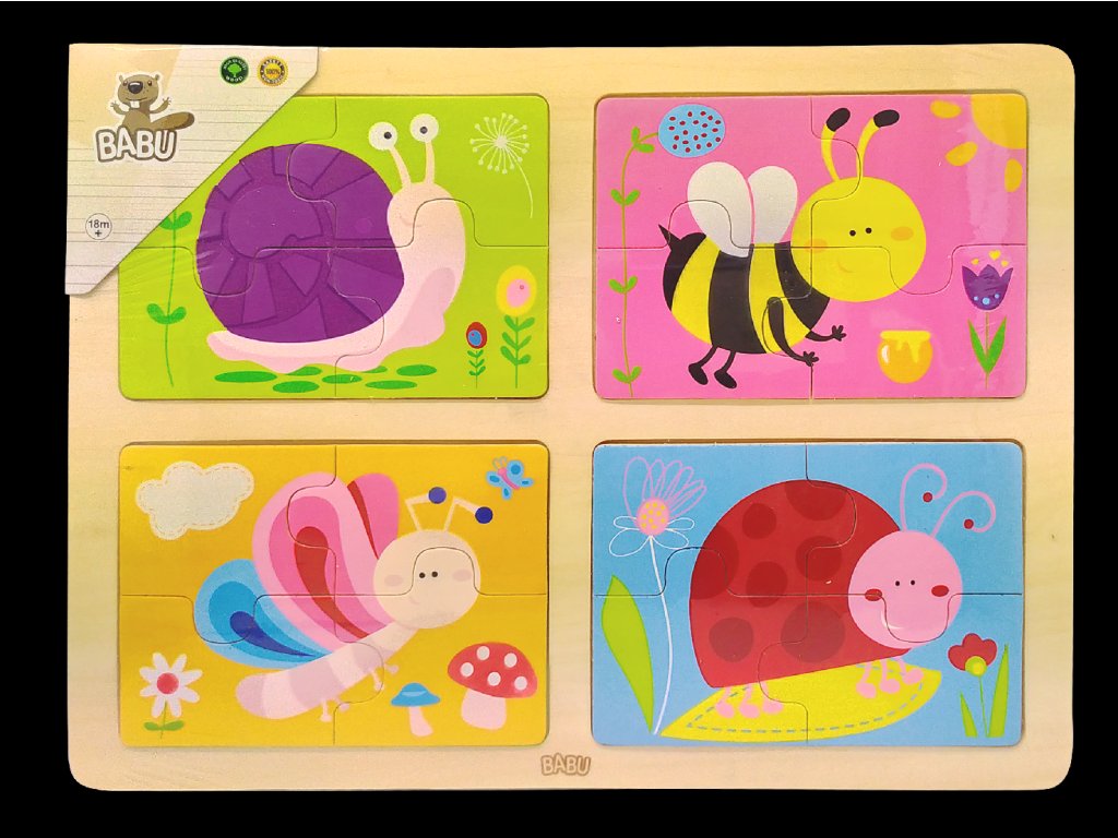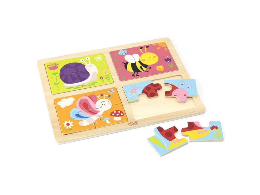 Skládání stavebnic a skládaček puzzle patří mezi nejoblíbenější dětské hry. Přinášíme Vám skládačku, kterou můžou skládat nejmenší děti. Skládačka je vyrobená ze dřeva, jsou na ní vyobrazeny milé obrázky kamarádů z louky a lučních motivů. Na destičce jsou čtyři různé obrázky, každý obrázek se skládá ze 4 dílků! Z kolekce dřevěné hračky od kvalitní značky BABU. - Rozměr hračky: 30x22,5cm - Věk 18m+