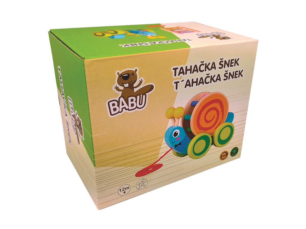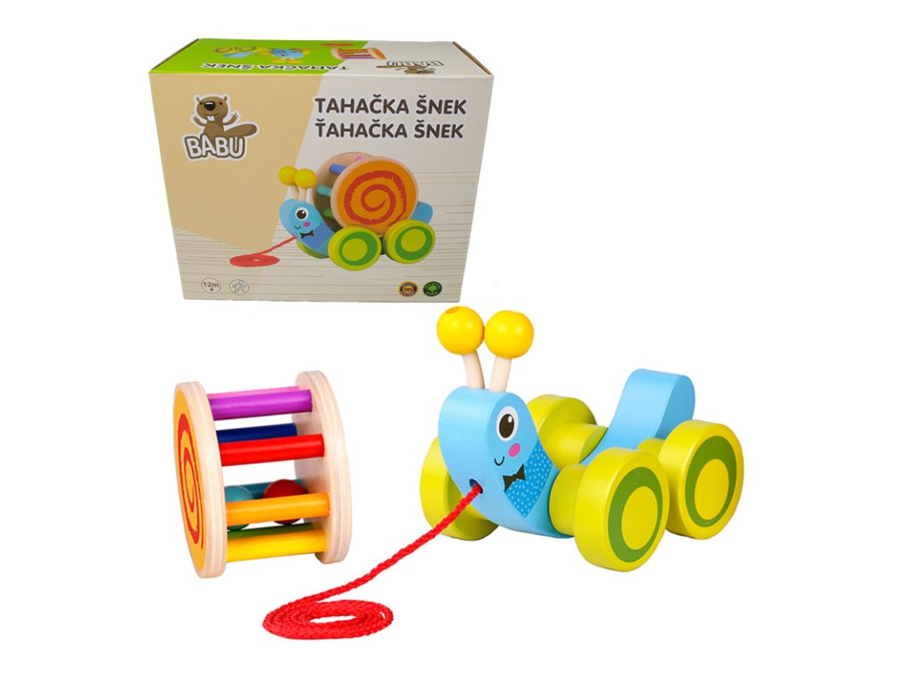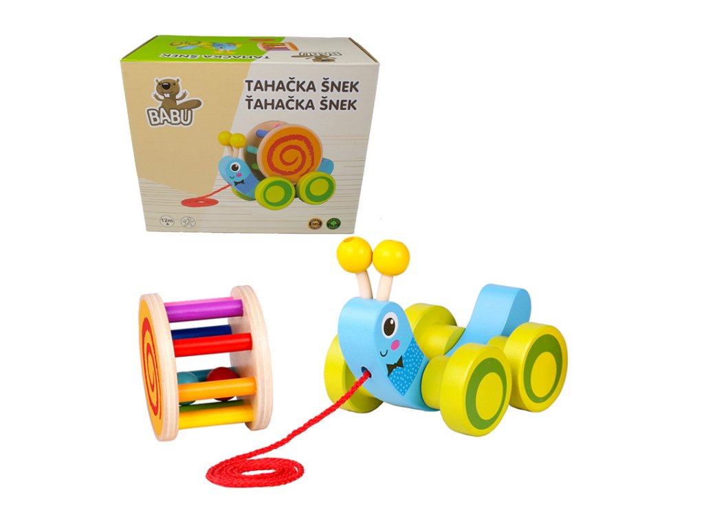 Šnek tahací - dřevěná hračka . Vezmi svého kamaráda na vycházku. Dřevěná tahací hračka ve veselých barvách .12m+