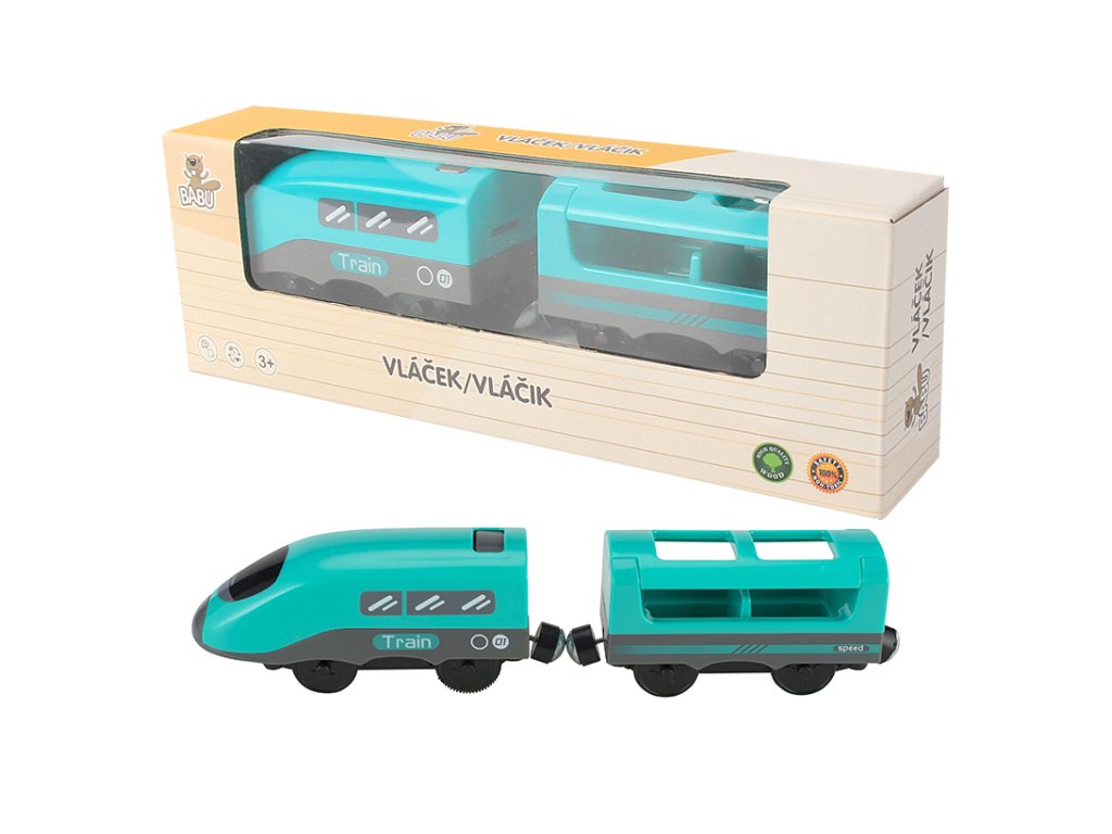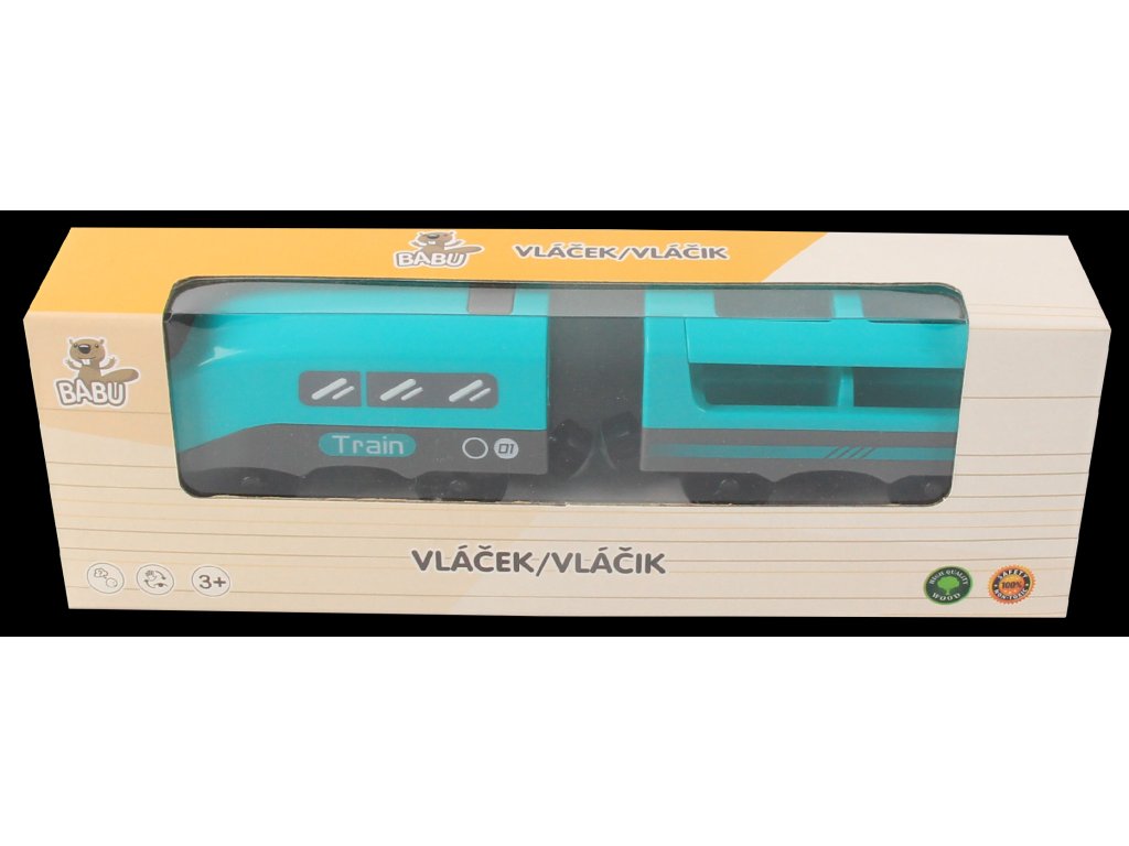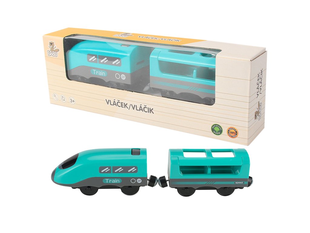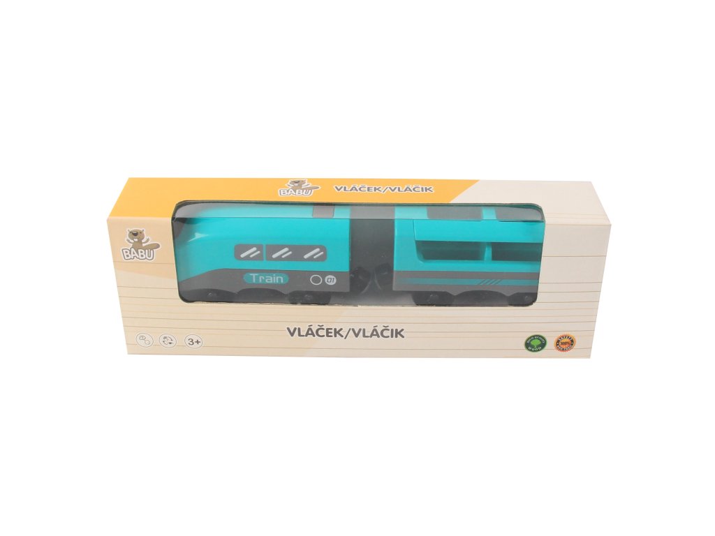 Vláček na baterie k dřevěným vláčkodráhám.Baterie 2x AAA 1,5V není součástí