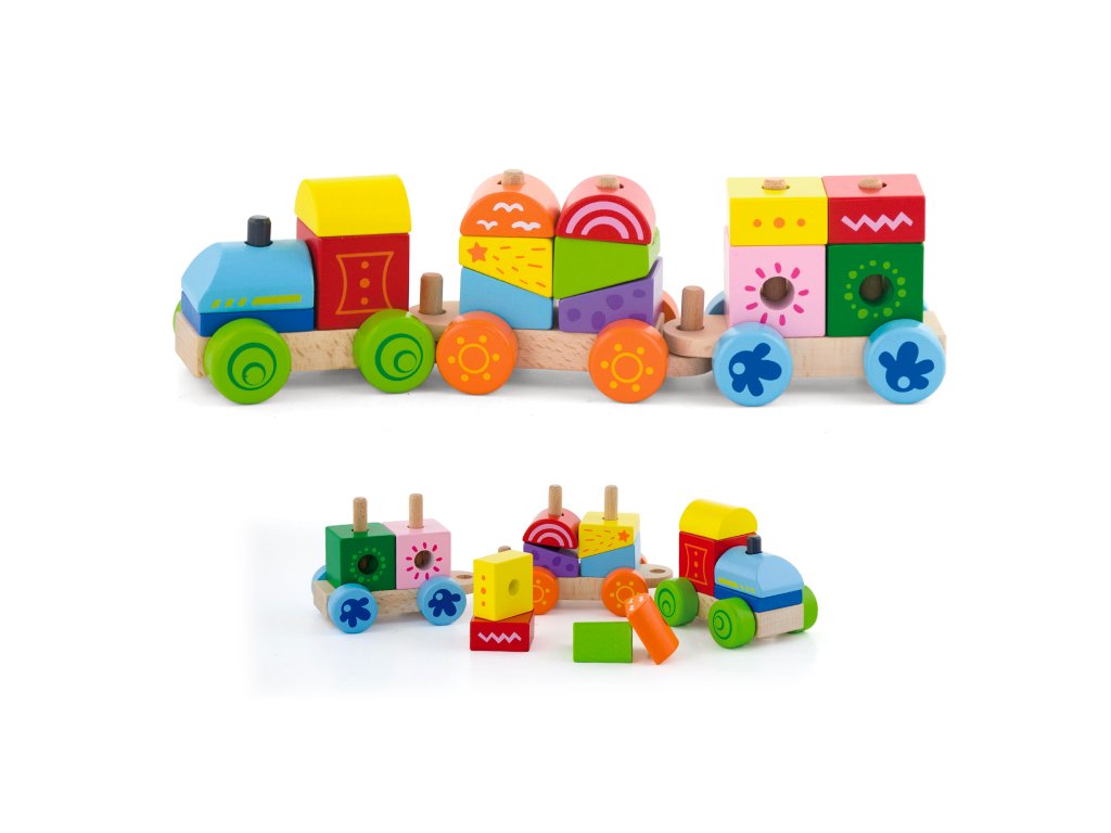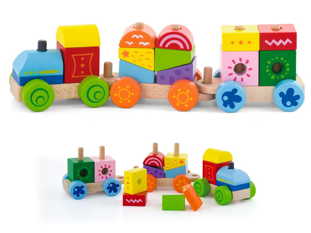 Krásný dřevěný vláček s vagónky a nákladem. Sundej a nandej kostičky na správná místá. Jednoduchá zábavná hra, která rozvíjí dětskou motoriku i logické myšlení. - Věk 18m+