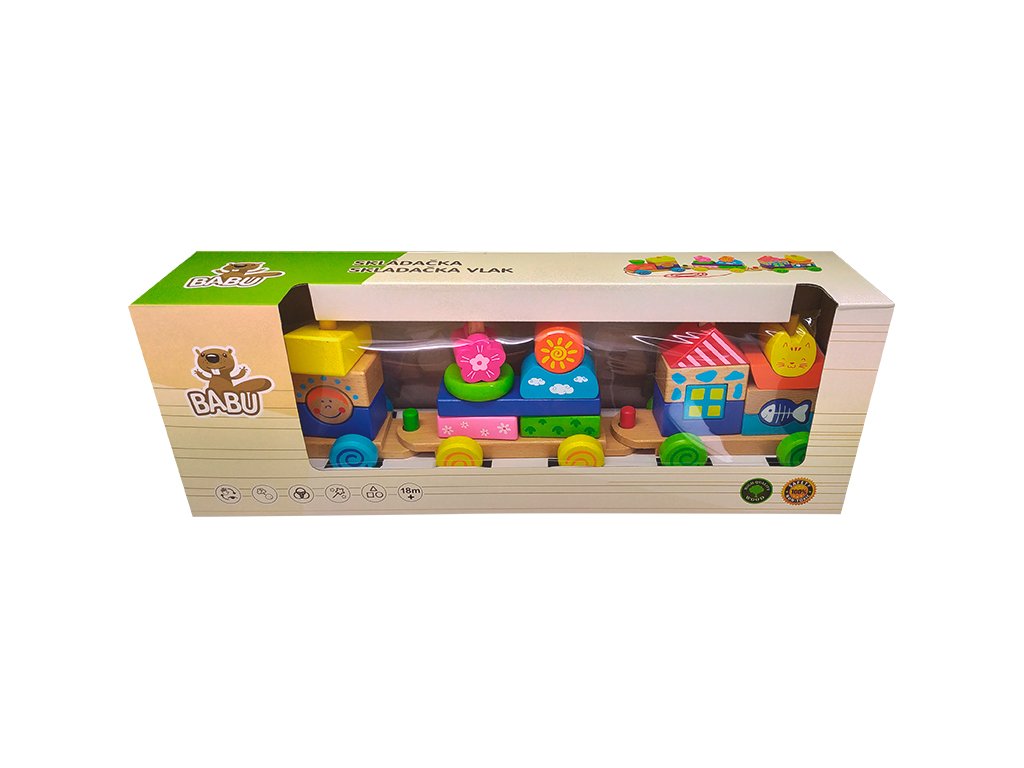 Jednotlivé části vláčku se dají vyndávat a skládat, dle libosti, díky čemuž si procvičuje představivost a koordinace vjemů dítěte. Na přední části vláčku je připevněný provázek za který lze vést vláček za sebou. Je vyrobený celý ze dřeva a každá část nákladu je originální tvarově i barevně. Už nikdy nebudete muset vozit ten samý náklad sem a tam. Vláček je zabalený v praktickém boxu od značky BABU. Věk 18m+ Rozměry složeného vláčku 47x12x9cm