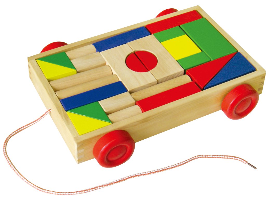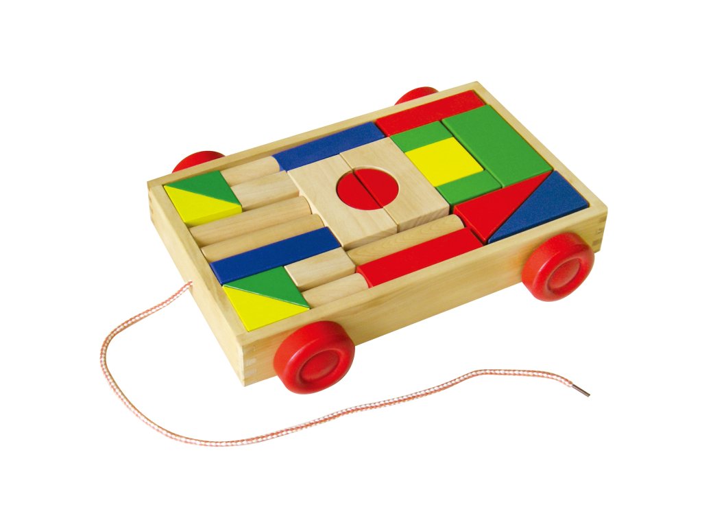 Dřevěný vozík plný barevných kostiček. Díky pevné šňůrce ho za sebou děti mohou tahat. Z kolekce dřevěné hračky od kvalitní značky BABU. - Rozměry: cca 33x24cm - Věk 2+