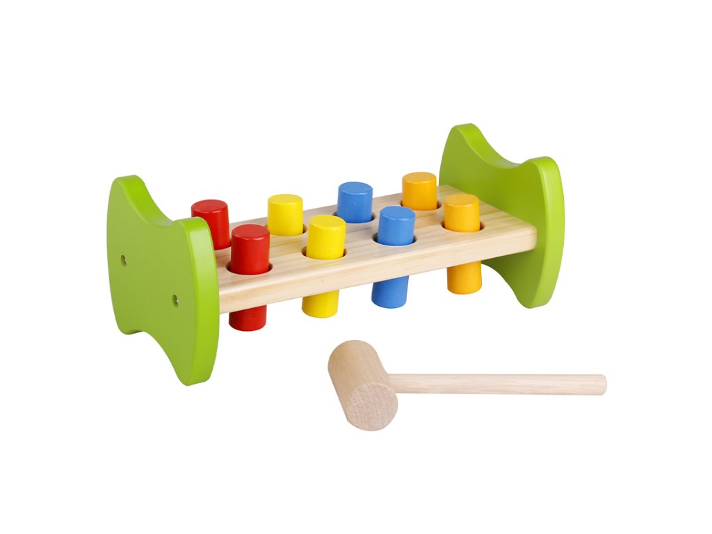 BABU - Zatloukačka.Velmi oblíbená hračka ze dřeva. Klasická zatloukačka ze dřeva určená pro nejmenší děti. Barevná dřevěná hračka obsahuje destičku, barevné kolíky na zatloukání a dřevěné kladívko. Děti se trefují kladívkem do kolíčků a rozvíjí svoji jemo