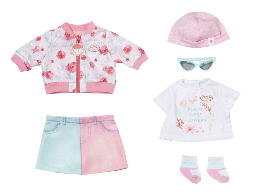 Baby Annabell Jarní souprava Deluxe pro panenky velikosti 43 cm. Součástí je bunda, sukně, tričko, ponožky, čepička a sluneční brýle.