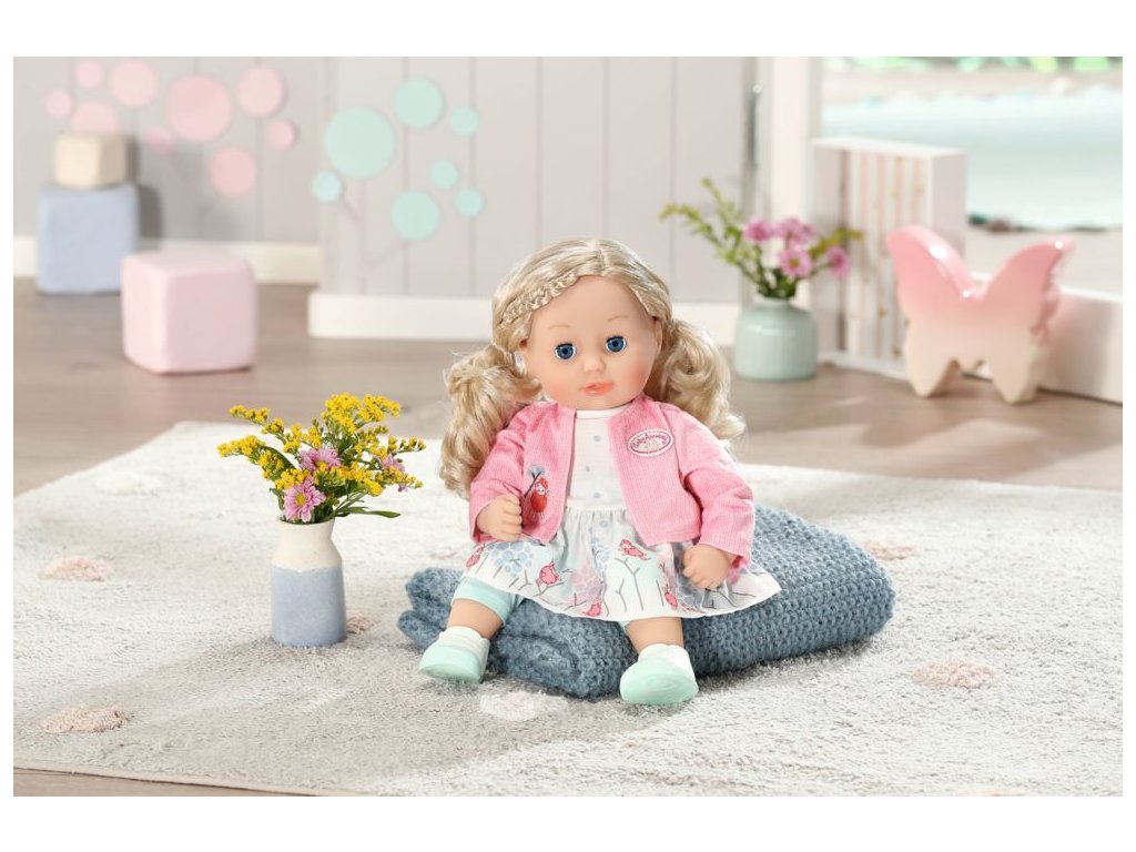 Když má někdo hodně vlasů, říká se: „…ten má ale hřívu.“ Panenka Sophia velikosti 36 cm má na hlavě velmi krásnou blonďatou „hřívu“. Její kvalitní vlásky lze upravovat do stále nových účesů. Po hře na kadeřnictví přijde na řadu spánek, protože ten je přece pro krásu také potřeba. Když položíš panenku na záda, zavře své blankytně modré oči. Sophia má na sobě roztomilé bílé šaty ozdobené obrázky oveček, jak sbírají bavlnu ze stromů. Růžová bundička s pleteným vzhledem je přišitá přímo k šatům. K tomu má Sophia oblečené světle modré legíny a obuté bílé tenisky. Oblečení je vyrobeno ve stylu „easy fit“, díky kterému převlékání panenky hravě zvládnou i ty nejmenší ručičky. • Originální panenka Baby Annabell. • Model „pro nejmenší“ (36 cm) s měkkým tělíčkem. • Oblečení ve stylu „easy fit“. • S mrkacíma očima. • Kvalitní vlasy pro tvoření účesů. • Pozvolna probouzí chuť ke hře s panenkou a podporuje rozvoj empatie a smyslu pro zodpovědnost u dětí už od jednoho roku. Baby Annabell Little Sophia je panenka velikosti 36 cm s mrkacíma očima. Oblečena je do šatiček 2v1, legín a botiček.