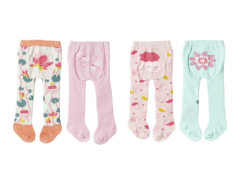 Baby Annabell Punčocháče (2 páry) pro panenky ve velikosti 43 cm. Na výběr dvě sady. Sada 1: růžové s vážkami a béžové se vzorem leknínů. Sada 2: mátové s leknínem a meruňkové s motivy oveček.