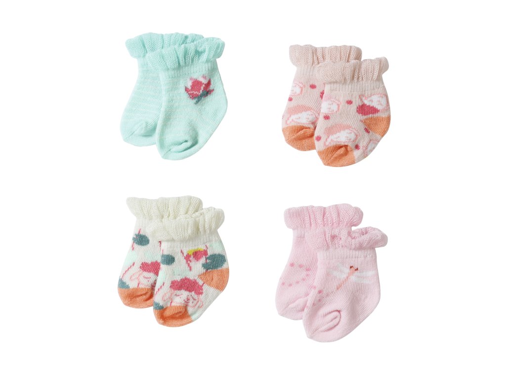 Doma chodí Baby Annabell většinou v ponožkách. Klouzat se v nich po podlaze je taková legrace. V prvním setu najdete jedny bílé ponožky pokryté krásnými lekníny a jedny mátové s jemnými bílými proužky. Druhý set je složen z jednoho páru růžových ponožek s vážkami a z jednoho páru meruňkových ponožek s ovečkami. Všechny ponožky jsou ozdobeny volánkovým okrajem.