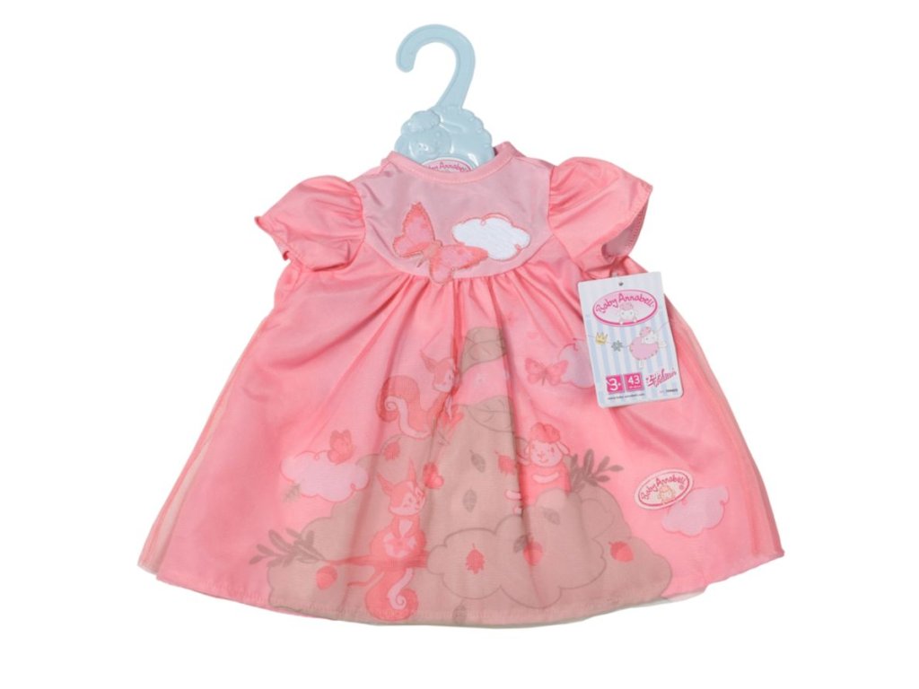 Růžový motýlek poletuje mezi nadýchanými bílými mráčky. Baby Annabell by už snad ani nemohla mít krásnější letní den. Stejné obrázky zdobí i dekolt růžových šatiček. Zbývá už jen jediná otázka. Zdalipak se veverka a ovečka na sukýnce lístečky pouze ovívají nebo se jejich máváním snaží vytlačit mráčky ještě výš do nebe? Ať je to tak či tak, jisté je, že Baby Annabell to bude v těchto vzdušných šatičkách vždy slušet.