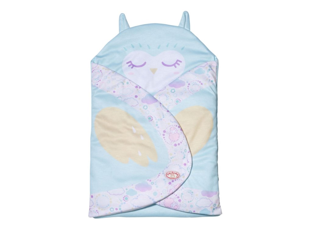 “Húú, húúú, Baby Annabel spí celou noc!” Nejprve se malá hlavička položí do středu modré zavinovačky tak, aby zátylek pohodlně ležel na soví tvářičce. Roztomilá ouška legračně vyčnívají nad hlavičkou panenky. Poté se boční díly přeloží dovnitř známou zavinovací technikou. Boční díly nejenže připomínají křidélka, ale mají je na sobě dokonce i natištěny. Baby Annabell zachumlaná do zavinovačky se sovou klidně usne. Sladké sny!