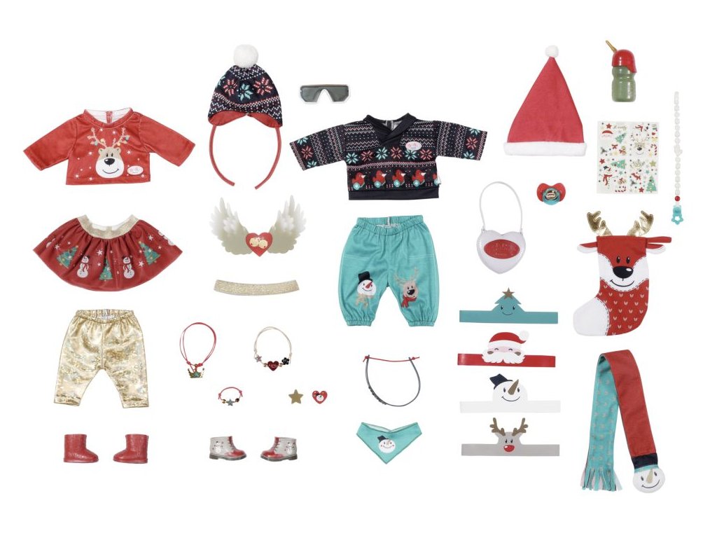 BABY born v předvánočním čase nosí své modely s vánočními motivy. Má dva měkoučké svetry, kalhoty, zlaté legíny, sukni a kabelku ve tvaru srdíčka. Když jde ven, může si ještě vzít šátek na krk, šál, čepičku a stylové sluneční brýle. V Adventním kalendáři samozřejmě nesmí chybět vánoční čepice a další roztomilé doplňky.