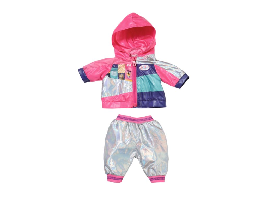Připravte se na Tour de BABY born! Sportovní bunda v moderních barvách dodává BABY born atraktivní sportovní vzhled. Praktická kapuce chrání malou závodnici před větrem a rozmary počasí. Lesklé stříbrné kalhoty s pružným pasem zaručují, že se BABY born může pohodlně hýbat po celý závod až do cílové rovinky.