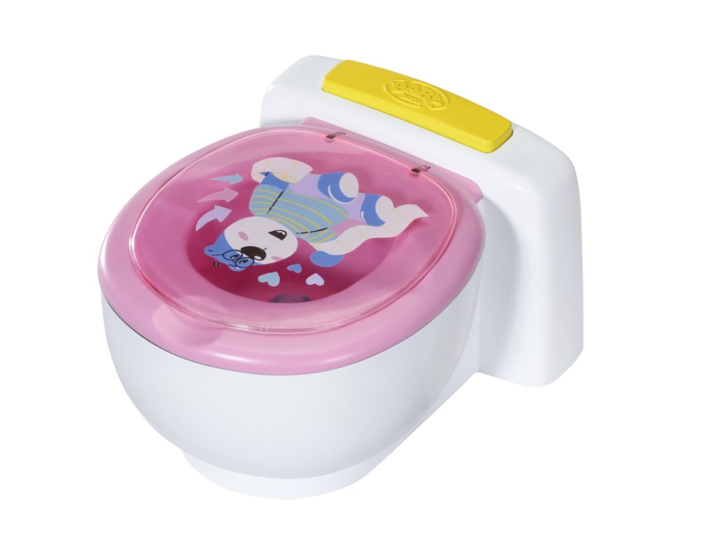 BABY born už chodí na záchod! Jakmile se posadí na svůj bílý trůn s růžovým sedátkem, uslyšíš zvuky čůrání, potlesku a veselého smíchu. BABY born se ale umí i vykakat. V tom případě se v míse objeví barevné třpytivé kakání. Rychle, je čas spláchnout! Když stiskneš splachovací tlačítko, kakání zmizí a uslyšíš zvuky spláchnutí.