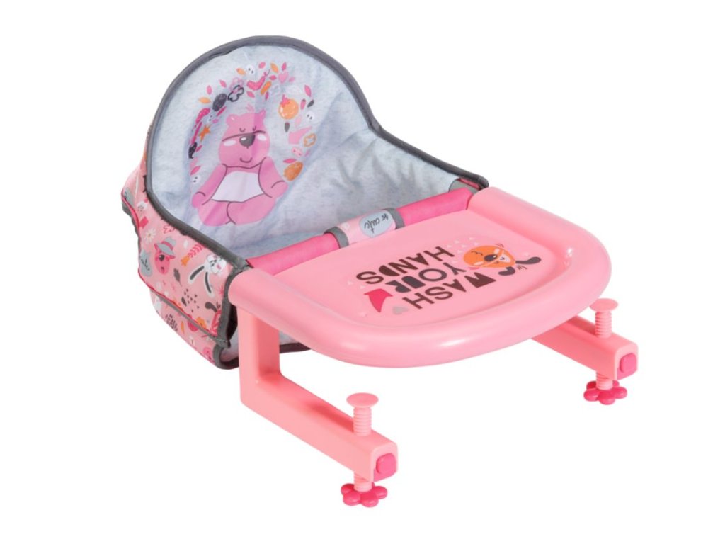 Panenka BABY born má často hlad doslova jako medvěd. Zůstává ale v klidu, stejně jako medvídek Bruno na opěrce židličky. Tento praktický doplněk umožňuje panence BABY born sedět a jíst u stolu spolu s její rodinou. Od každého tak může dostat trochu ochutnat. Před jídlem si BABY born samozřejmě umyje ruce. To pro jistotu připomíná i nápis „wash your hands“ – tedy „umyj si ruce“ na růžovém stolečku. Sedačku lze připevnit ke stolu s tloušťkou desky 15–40 mm.