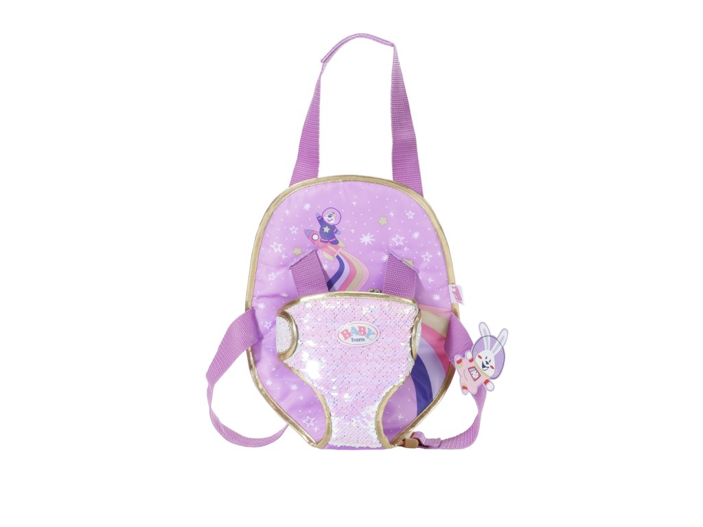 Stylový kousek s narozeninovým designem je velmi elegantní. Sedátko je pošito oboustrannými pajetkami a polstrování zad je ozdobeno potiskem hvězd a vesmírných motivů. Zajíček Benno se výletu účastní na popruzích jako kosmonaut. Systém popruhů je nastavitelný a díky tomu vhodný pro různě velké děti.
