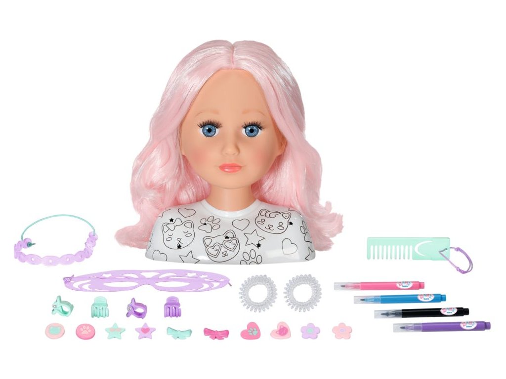 S BABY born Kreativní česací hlavou se fantazii a kreativitě meze nekladou. Česací hlavu vysokou 22 cm lze nalíčit a namalovat pomocí dodaných fixů a šablony. Ale to není vše: vybarvit lze i tričko panenky. Tričko můžete také dozdobit některými z 10 nacvakávacích ozdob. Zlatým hřebem jsou samozřejmě dlouhé růžové vlasy z vysoce kvalitního nylonu. Pomocí doplňků z balení lze vykouzlit ty nejúžasnější účesy. Čelenku do vlasů můžete také ozdobit barevnými nacvakávacími ozdobami.