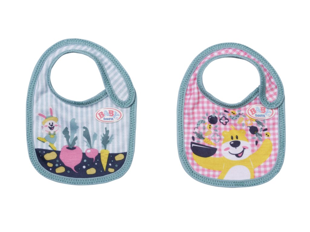 To se dalo čekat. Dva bryndáky na výběr a BABY born se prostě nemůže rozhodnout, který si vezme k obědu. Na modelu se zelenými proužky zajíček Benno vesele hopká mezi záhony s mrkví a červenou řepou. Model s růžovým károvaným vzorem má na sobě potisk šéfkuchaře medvídka Bruna, který vaří zeleninovou polévku. Doufejme, že výběr jídla nebude trvat stejně dlouho jako výběr bryndáku...