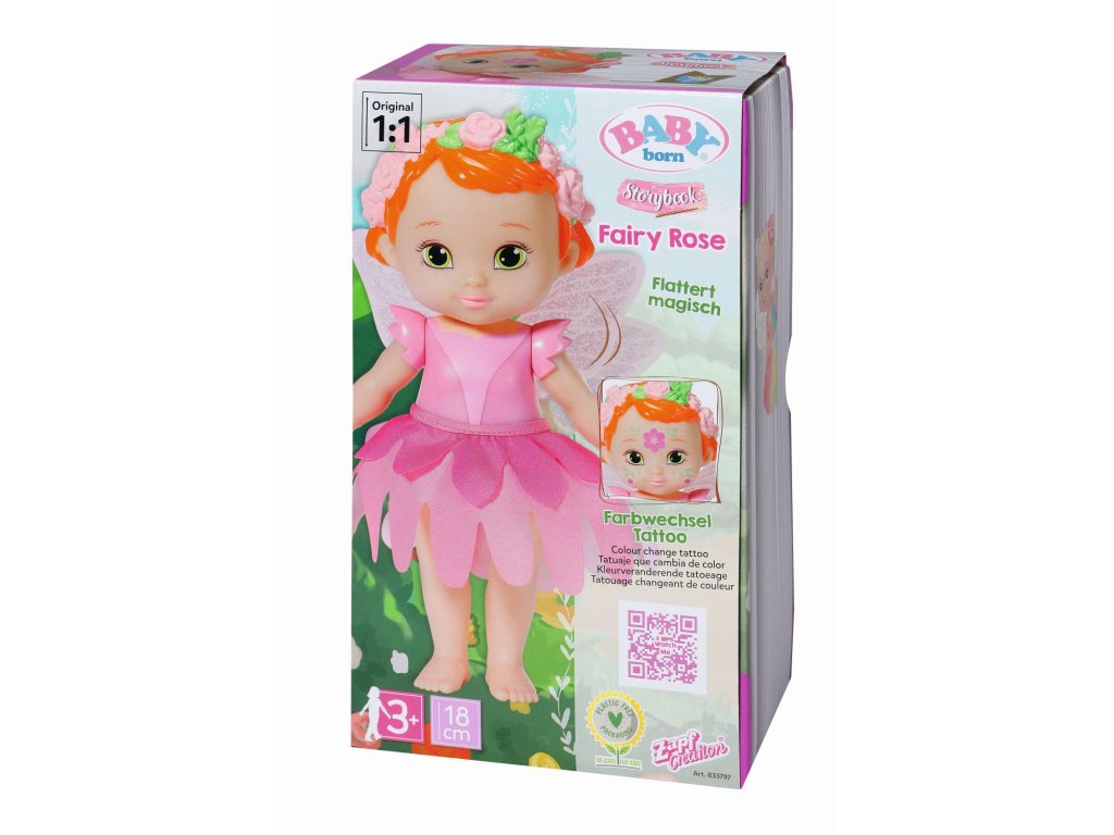 BABY born Storybook Růžičková víla je panenka velikosti 18 cm. Součástí je kouzelná hůlka, pódium, kulisy a obrázková knížka.