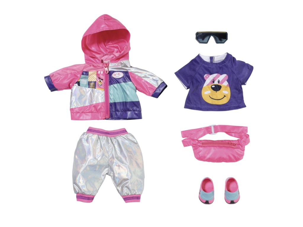 BABY born Souprava na kolo Deluxe pro panenky velikosti 43 cm. Součástí je mikina, tričko, kalhoty, boty, ledvinka a sluneční brýle.