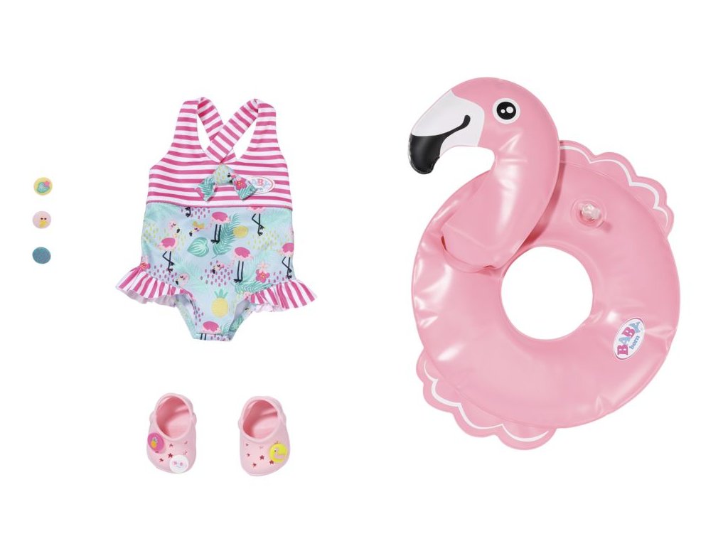 BABY born Souprava na plavání pro panenky velikosti 43 cm. Součástí jsou plavky, sandálky s nacvakávacími ozdobami a gumový kruh.
