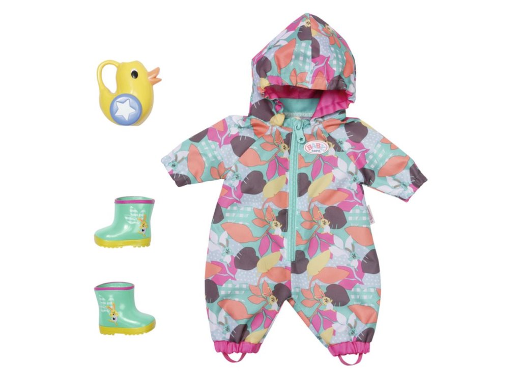 Jaro je obdobím sázení. Napřed se ale ze záhonů odstraní podzimní listí. A právě to je ten pravý čas obléct si overal BABY born. Tyrkysový overal s kapucí a zipem je na přední straně poset potiskem barevných listů. V rozbředlé hlíně nosí malá zahradnice nejraději holínky. Jakmile jsou sazeničky a semena zasazené, BABY born vše zalije konvičkou ve tvaru kačenky.
