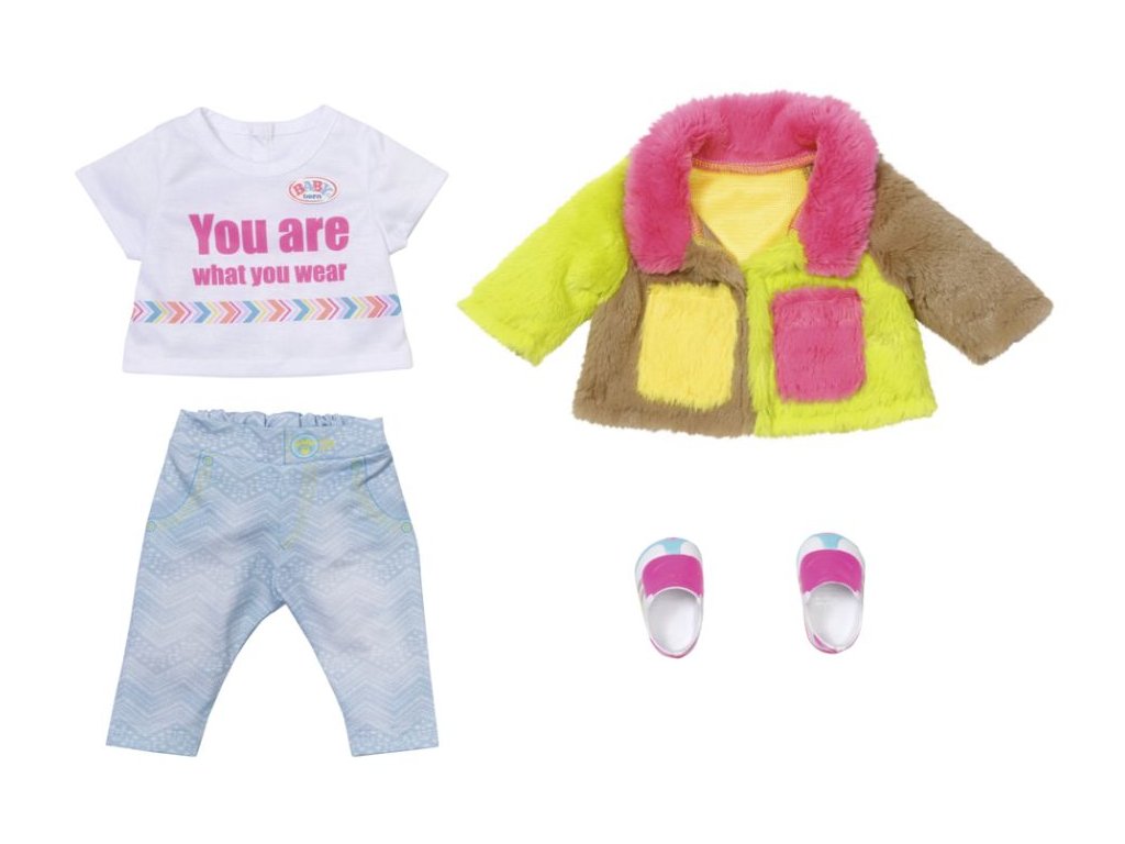 BABY born Souprava s barevným kabátem Deluxe pro panenky velikosti 43 cm. Součástí je kabát, tričko, kalhoty a boty.