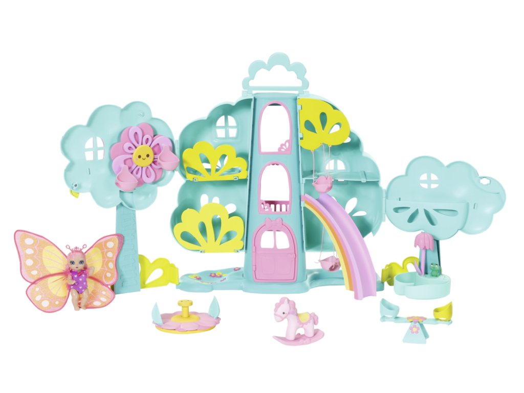 Čáp a datel společně postavili stromový domeček. Ve dvoupatrovém domečku bydlí exkluzivní miminko BABY born Surprise v roztomilém růžovém body a třpytivými žluto-oranžovými křídly. V domečku i kolem je opravdový zábavní park. Miminka můžou vyjet výtahem do horního patra, kde je zavěšena houpačka a nainstalován kolotoč. Zpátky dolů na zahradu se svezou po duhové skluzavce. Na zahradě se miminka můžou houpat pod skluzavkou, na houpacím koníkovi, na dvouramenné houpačce nebo se svézt na kolotoči. Květinková sprcha s žabí pumpou poskytuje vítané ochlazení opravdovou vodou.