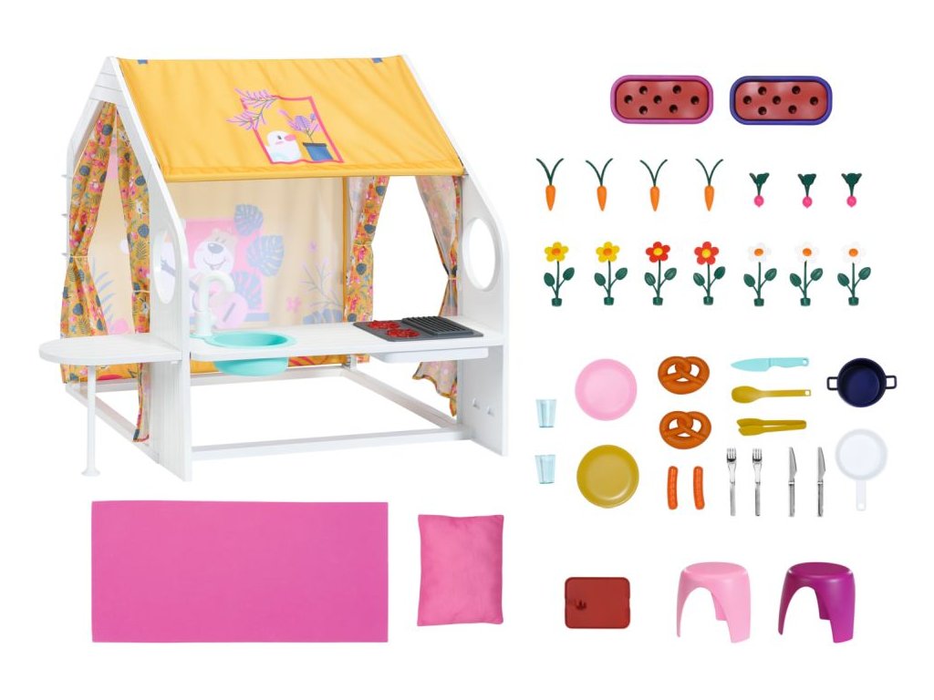 Když k víkendovému domku dorazí, tak nejdříve otevřou žluté boční stěny, aby bylo na vše dost místa. Pak se postarají o květiny v truhlících a sklidí zeleninu k večeři. Zatímco se na sporáku připravuje jídlo, BABY born prostírá stůl. Podává se salát z mrkve a ředkviček a nechybí ani párky a preclíky. Po jídle je samozřejmě třeba umýt nádobí.