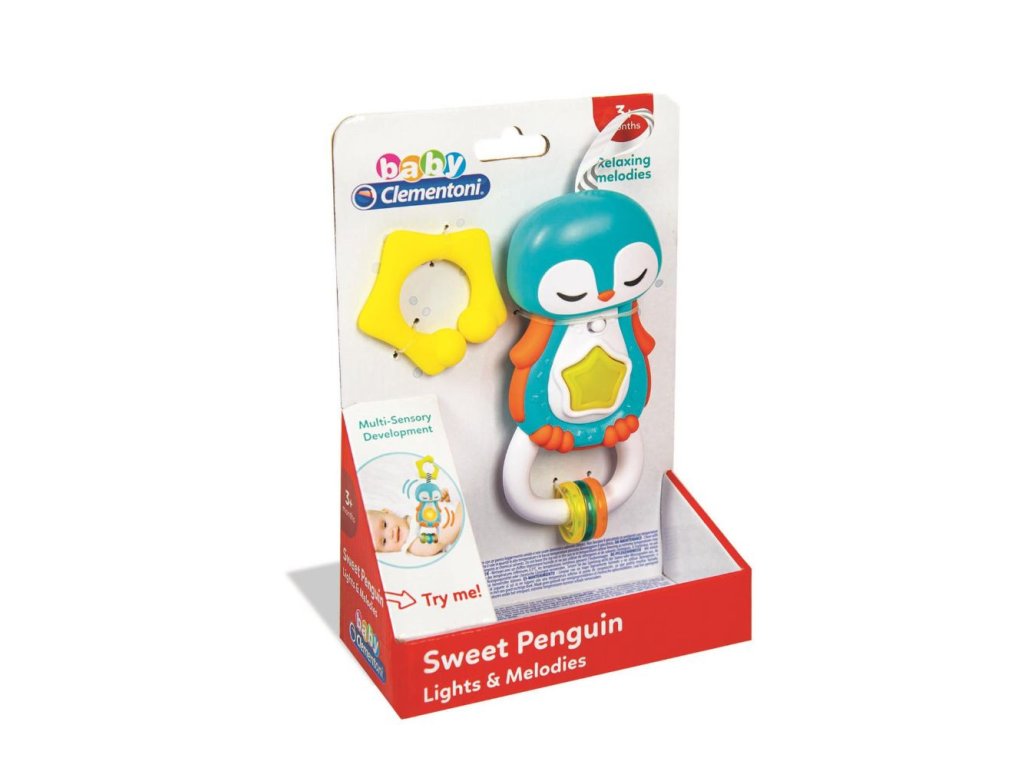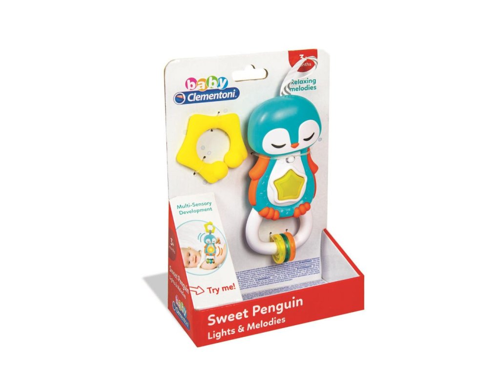 Clementoni interaktivní chrastítko tučňák. Stlačením rozsviť hvězdičku, aktivuj sladké melodie a zvukové efekty. Praktický kroužek na zavěšení do postýlky, kočárku nebo autosedačky. Přívěsky a různé druhy materiálů podporují rozvoj smyslů dítěte. Vyrobeno z kvalitního a nezávadného materiálu. Baterie: 3x1,5V AG13/R44 (součástí výrobku jsou baterie pouze demonstrativní účely).