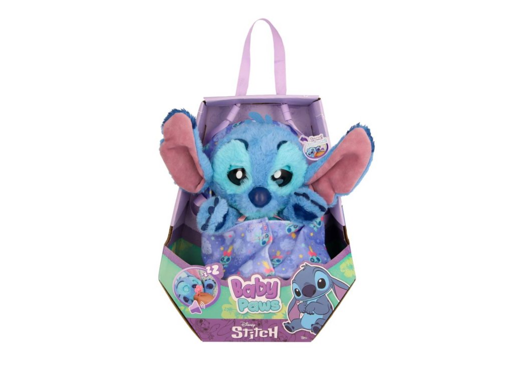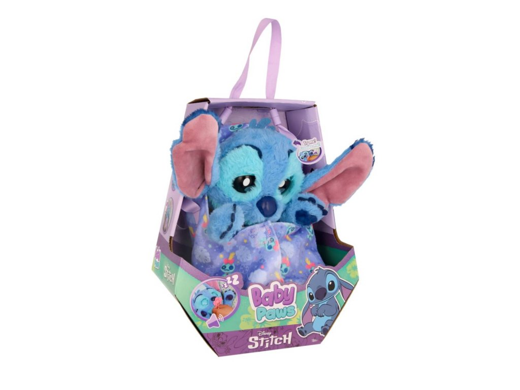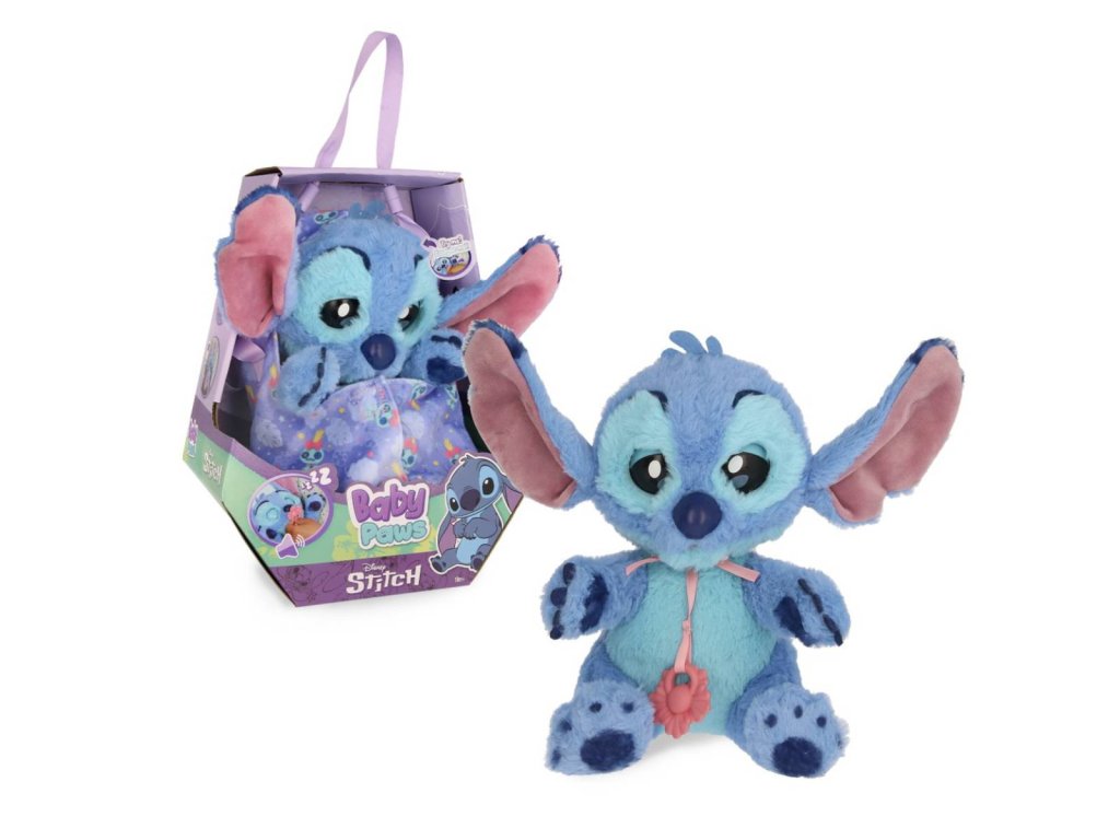 Baby Paws – plyšové štěňátko Stitch je interaktivní plyšová hračka inspirovaná postavičkou Stitche z filmu Lilo & Stitch. Tento roztomilý kamarád je vyroben z měkkého a huňatého plyše v typických modrých odstínech, které věrně odpovídají originálnímu vzhledu postavičky. Stitch má velké uši s růžovým vnitřkem, které jsou výrazným prvkem jeho designu, a jeho oči jsou navrženy tak, aby působily přítulně a živě. Plyšák sedí a má na krku zavěšený růžový dudlík, který slouží jako doplněk a pomáhá mu „usnout“.