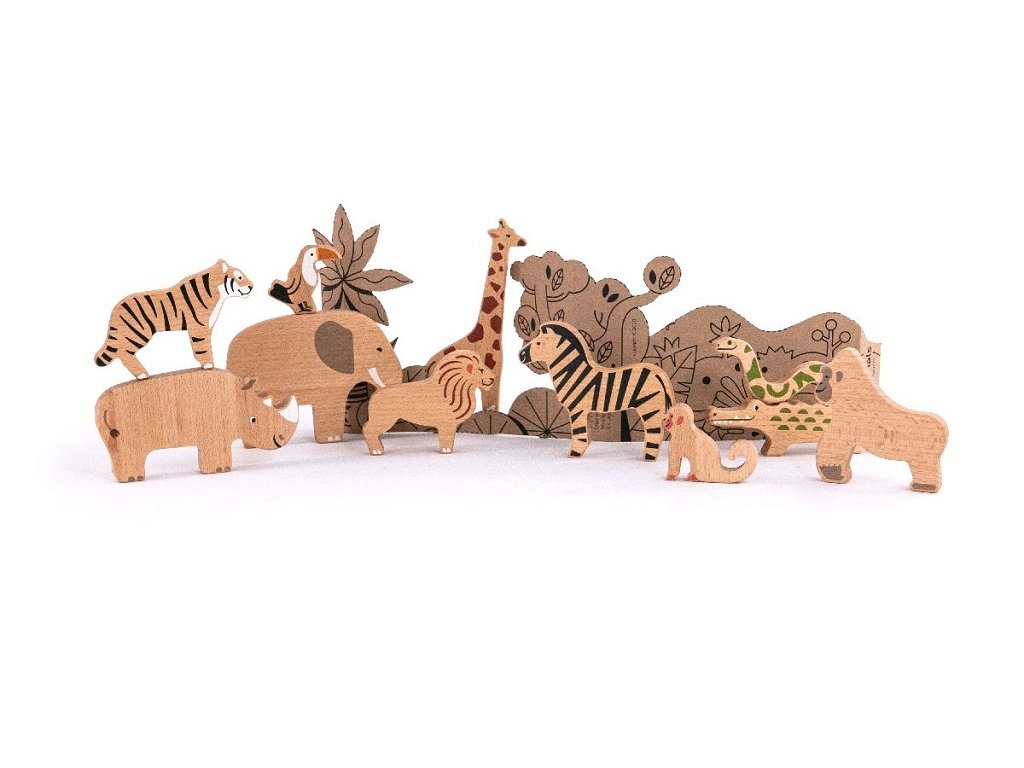 Koho můžete potkat v džungli? Tygra, gorilu nebo tukana.. Zvířátka byla navržena v moderním minimalistickém stylu. Liší se velikostí. Některé mají tloušťku 18 mm a jiné 13 mm, díky čemuž ukazují skutečný rozdíl ve velikosti mezi jednotlivými druhy. Figurky perfektně padnou do rukou malého dítěte. Obal této sady je jedinečný. Karton stačí naříznout podél vyznačených zářezů a vytvořit divokou džungli. Obsahuje: slona, gorilu, zebru, lva, tygra, nosorožce, hada, žirafu, krokodýla, tukana a opici. Velikost figurek: Slon: 14x10,6x1,8 cmGorila: 9,4x10x1,8 cmZebra: 10,2x11,6x1,8 cmLev : 11x8,5x1,8 cmTygr: 12,5x8x1,8 cmNosorožec: 14,5x7,6x1,8 cmHad: 14x14, 6x1,3 cmŽirafa: 9,4x19x1,3 cmKrokodýl: 17x 5x1,8 cmTukan: 6,6x5,7x1,3 cmOpice : 7x6x1,3 cm Jedinečnost dřevěných hraček spočívá v tom, že jsou zcela bezpečné pro zdraví dítěte. Společnost Bajo nabízí mnoho hraček lakovaných barvami, proto je jejich prioritou kvalita a zdravotní nezávadnost, která je potvrzená certifikáty. Kontrolovány a testovány jsou také prvky vyrobené z plastu a kovu. Tato hračka a obal jsou vyrobeny z přírodních zdrojů a lze je snadno recyklovat. Doporučujeme povrch hračky čistit pouze vlhkým hadříkem. Nevystavujte, prosím, tuto hračku vysokým teplotám nebo vysoké vlhkosti, dřevo se za těchto podmínek může ohýbat a deformovat. Splňuje všechny evropské bezpečnostní normy. Hlavní vlastnosti: bukové dřevopodněcuje ke kreativní hře