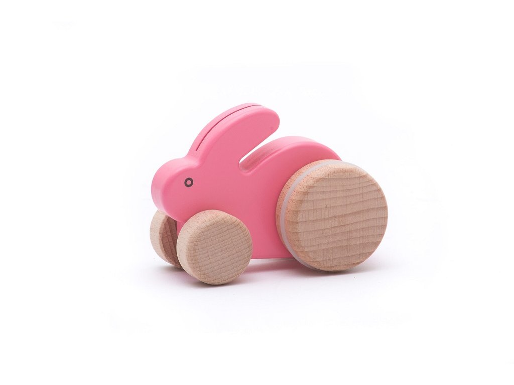 Co to utíká?Je to malý králíček, který nemá žádný pohon a je nejvytrvalejší v závodění. Jak je tohle možné? Hračka má jednoduchý mechanismus. Dvě velká kola jsou těžká a jejich osa otáčení je mimo střed. To znamená, že se kolečka neotáčí ve středu, ale v kruhu. To dává efekt stoupání a klesání. Králíka je potřeba trochu popostrčit, aby začal poskakovat. Hračka svým charakterem a pohybovou animací působí na představivost dětí. Dítě hrající si s králíčkem poznává svět zvířat. Díky tomu si ho začne všímat a vážit si ho. Hračka také rozvíjí manuální dovednosti a přispívá k rozvoji hrubé motoriky, zahrnuje pohyby rukou a těla. Jedinečnost dřevěných hraček spočívá v tom, že jsou zcela bezpečné pro zdraví dítěte. Společnost Bajo nabízí mnoho hraček lakovaných barvami, proto je jejich prioritou kvalita a zdravotní nezávadnost, která je potvrzená certifikáty. Kontrolovány a testovány jsou také prvky vyrobené z plastu a kovu. Tato hračka a obal jsou vyrobeny z přírodních zdrojů a lze je snadno recyklovat. Doporučujeme povrch hračky čistit pouze vlhkým hadříkem. Nevystavujte, prosím, tuto hračku vysokým teplotám nebo vysoké vlhkosti, dřevo se za těchto podmínek může ohýbat a deformovat. Splňuje všechny evropské bezpečnostní normy. Hlavní vlastnosti: rozvíjí motorické dovednosti a stimuluje představivost a kreativitusnadno uchopitelné