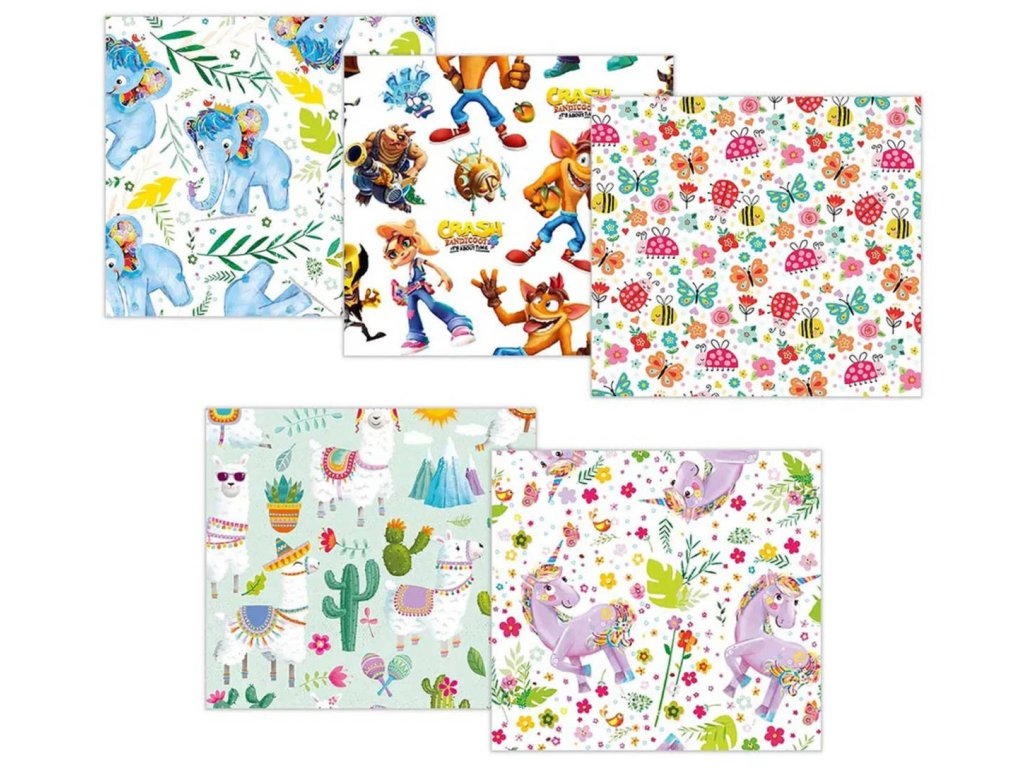 Balící dárkový papír s originálním motivem. Jednostranný potisk. Dětské motivy. Rolka obsahuje 2 archy papíru 100x70cm. 5 druhů.