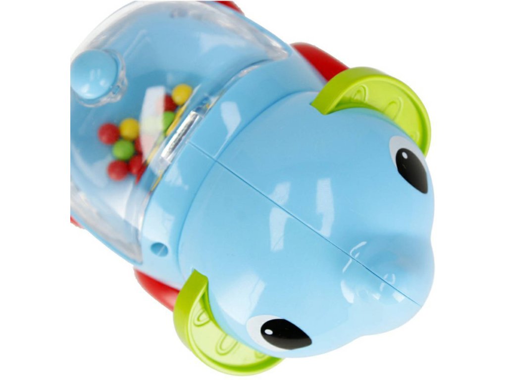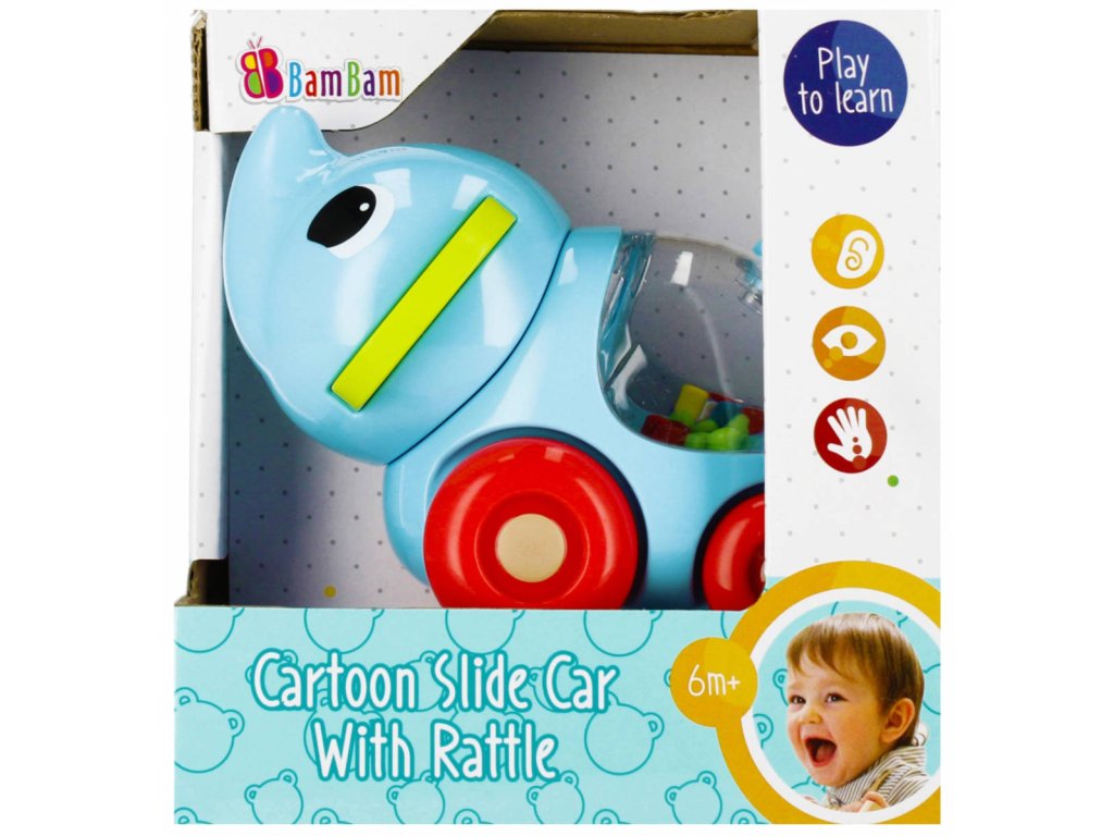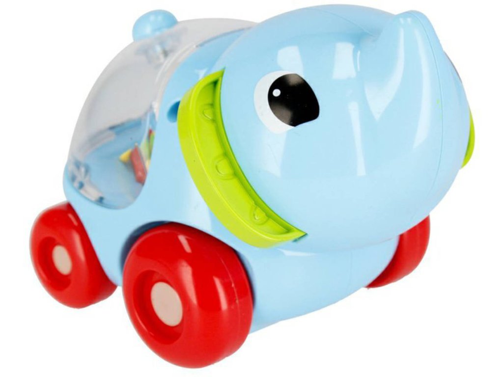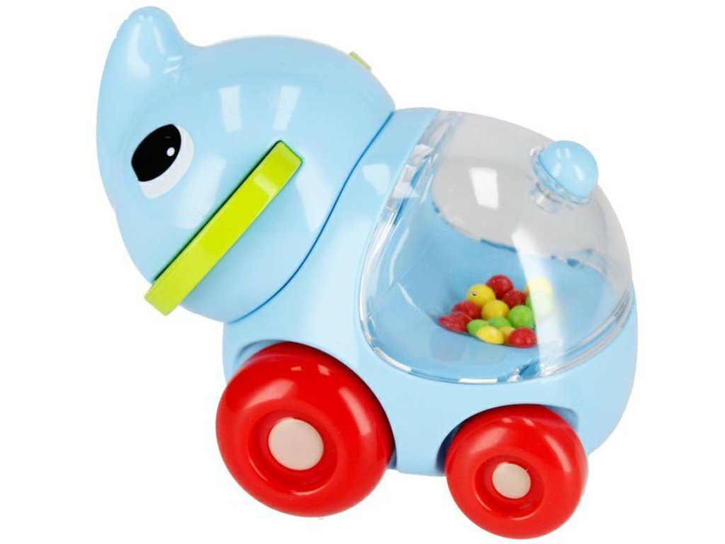 Chrastítko - autíčko ve tvaru půvabného slona s rotujícími kuličkami v bříšku, potěší nejedno miminko. Zvířátko na kolečkách poskytuje spoustu zábavy, motivuje dítě k samostatným pokusům o plazení nebo chůzi. Hračka při pohybu vydává chrastivé zvuky díky barevným kuličkám, umístěným v bříšku zvířátka. Rotující, barevné kuličky, poskytují dítěti vizuální podněty a podporují rozvoj jeho zraku a vnímání. Zaoblený tvar usnadňuje uchopení hračky a kolečka umožňují snadné uvedení hračky do pohybu zatlačením.