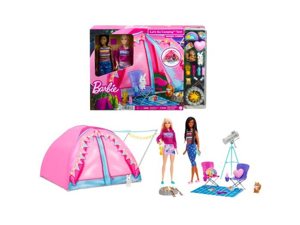 Tento herní set inspirovaný zbrusu novou sérií Barbie® vybízí k dokonalému dobrodružství s panenkou Barbie® „Malibu“ Roberts, panenkou Barbie® „Brooklyn“ Roberts a jejich vlastním kempingovým stanem! Látkový stan je vybaven markýzou a provázkovými světly – a díky prostoru pro čtyři panenky jsou možnosti vyprávění nekonečné. Set obsahuje více než 20 doplňků pro kempování. Nechybí dva rozkošní zvířecí kamarádi, židle, dalekohled a další. Panenky neumí samostatně stát. Barvy a vzhled výrobku se mohou lišit.