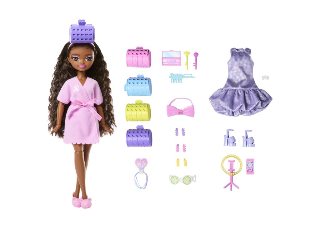 Připravte se na den plný módy, účesů a zábavy s panenkou Barbie „Brooklyn“! Panenka má dlouhé vlasy pro kreativní styling a spoustu doplňků, které se skrývají v natáčkách na vlasy – objevíte třeba sponky, oční stíny nebo ozdoby. Nechybí župan, okurková maska, boty na podpatku a večerní šaty pro finální look. Barbie můžete upravit od hlavy až k patě – s pomocí paletky i kartáčku! Ideální pro děti od 4 let, které milují módu, účesy a hru na proměny.